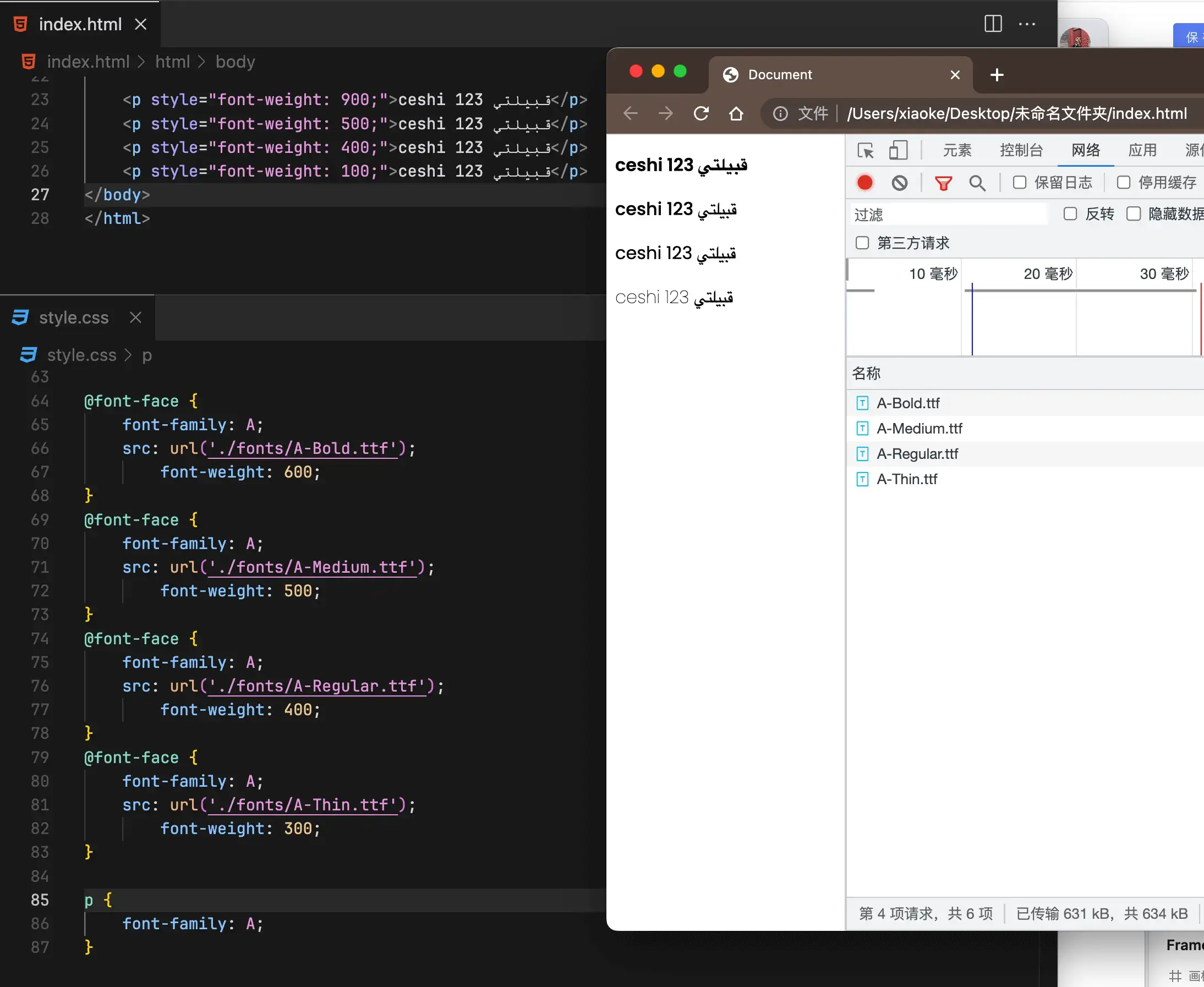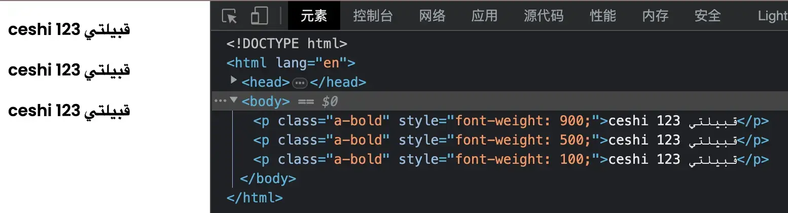 我们来看下面这个例子,我们使用同一个字体, font-weight 分别设置为900、500、100,结果我们看到的字体粗细是一样的。